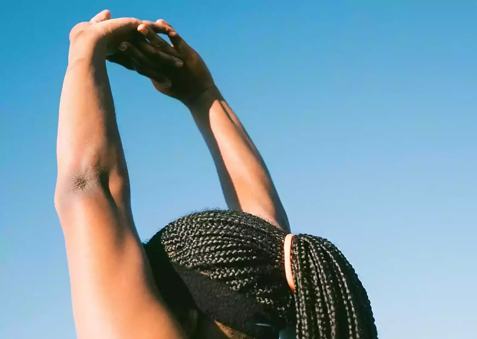 - Take a deep breath, interlock your fingers, and raise your arms